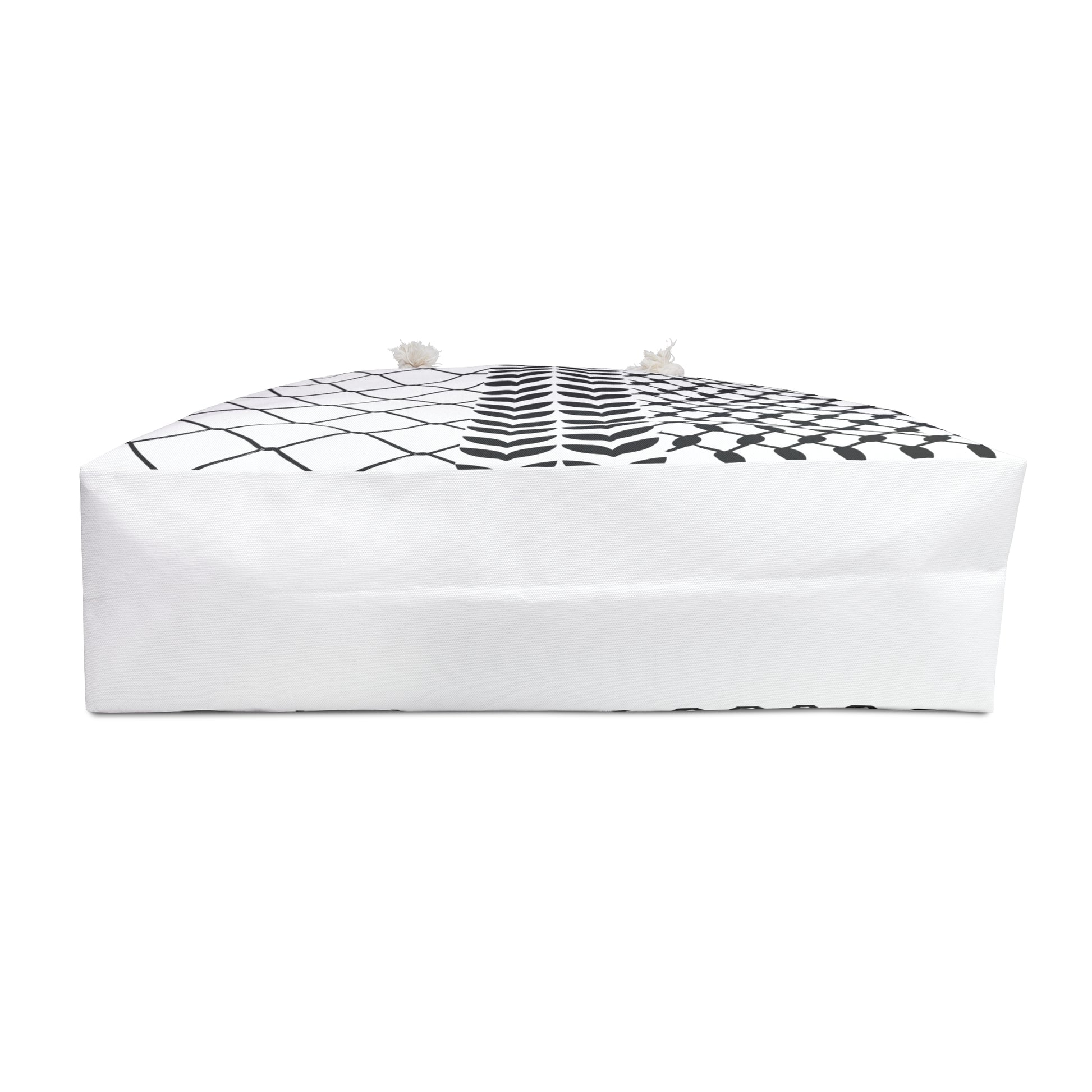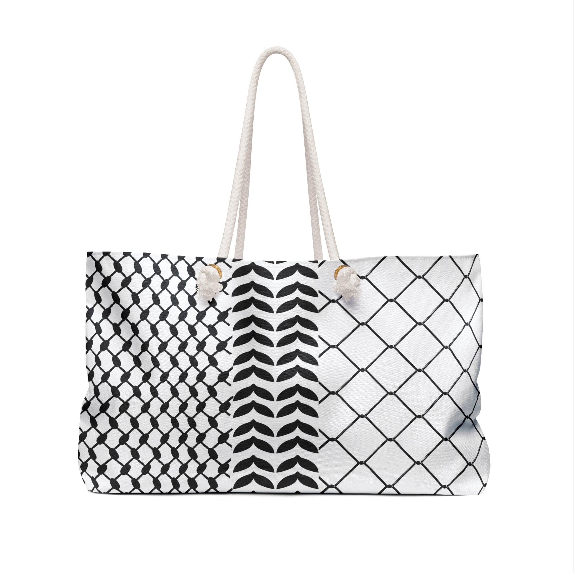 This oversized Weekender Tote is your go-to for beach days, city outings, or weekend getaways. Featuring the iconic Kufiya pattern, it offers both style and cultural significance, making it the perfect accessory for those who want to blend fashion with a meaningful statement. With its spacious design, this tote can hold everything you need, from personal items to beach essentials.