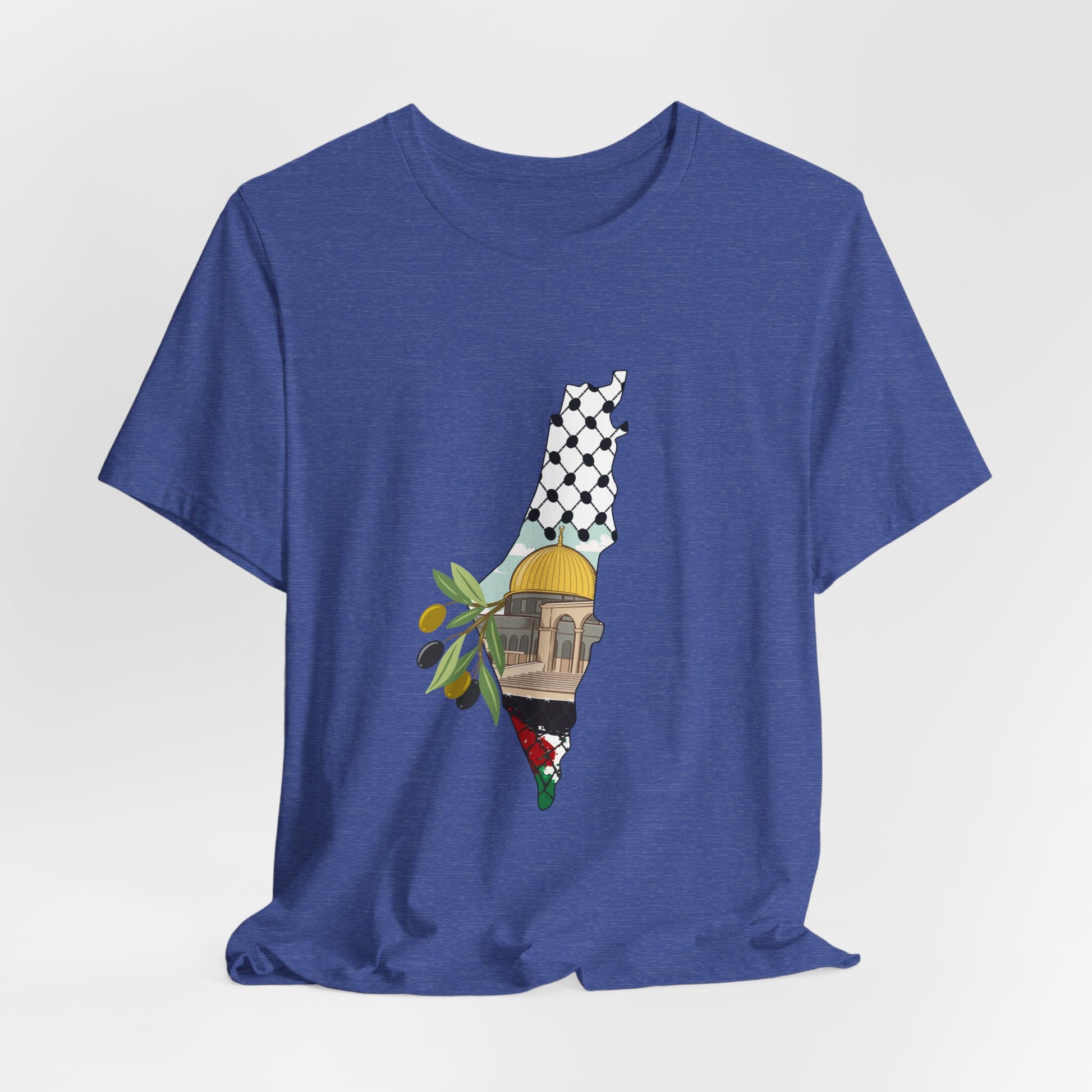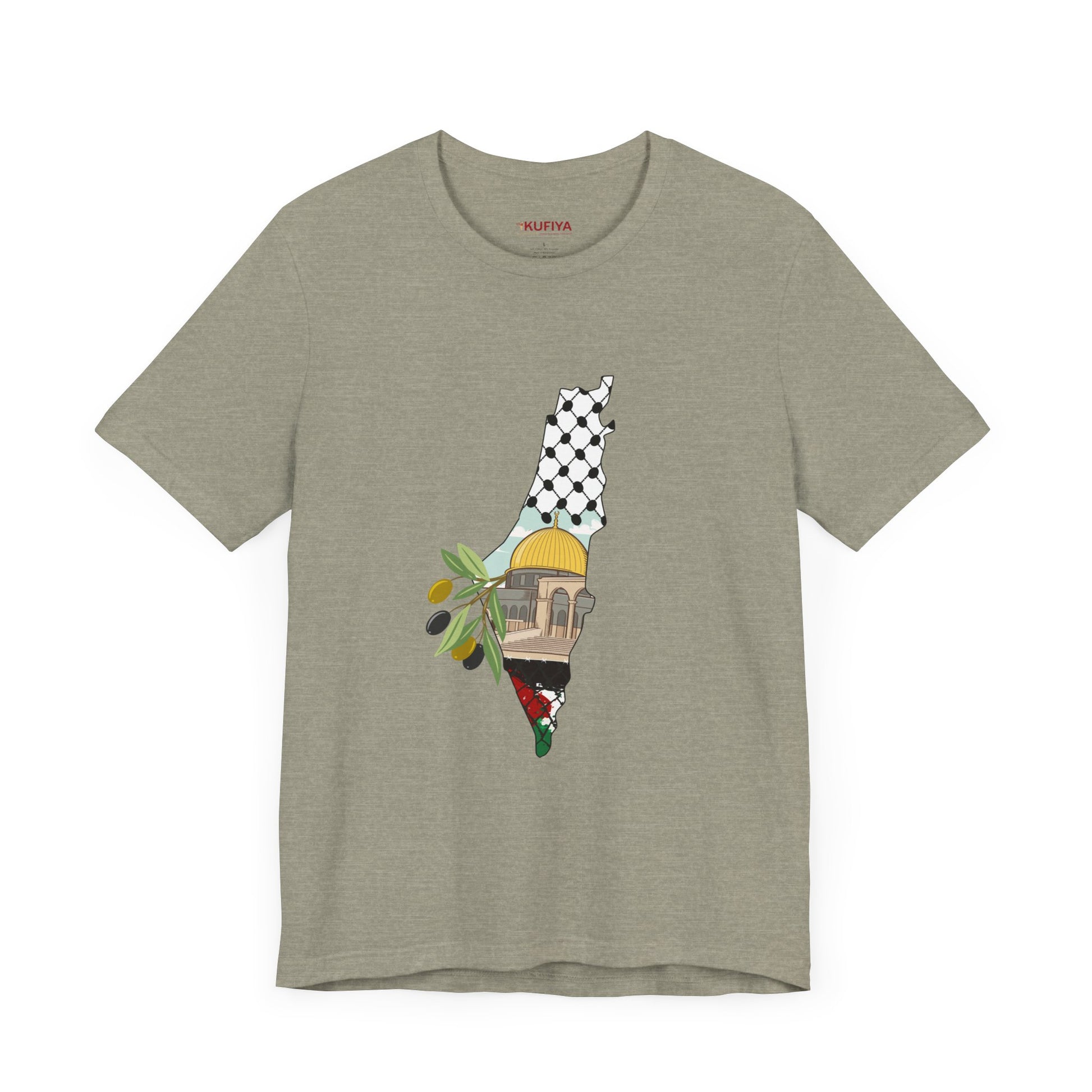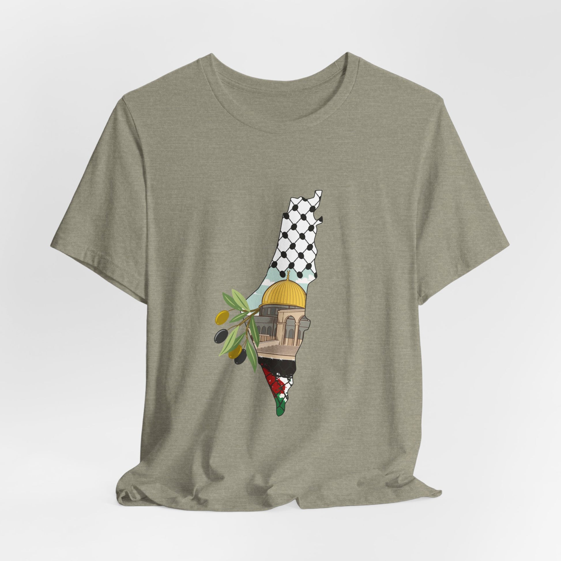 Featuring the outline of Palestine, adorned with the iconic Dome of the Rock and olive branches, this design is a powerful statement of support.