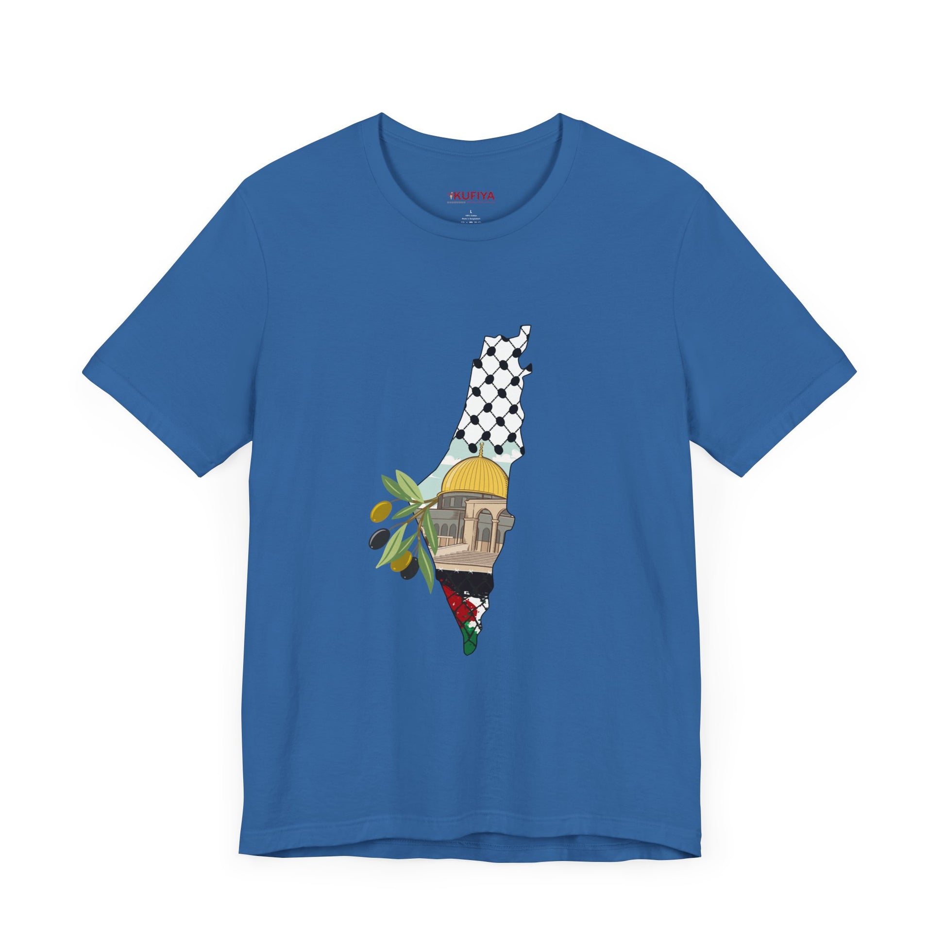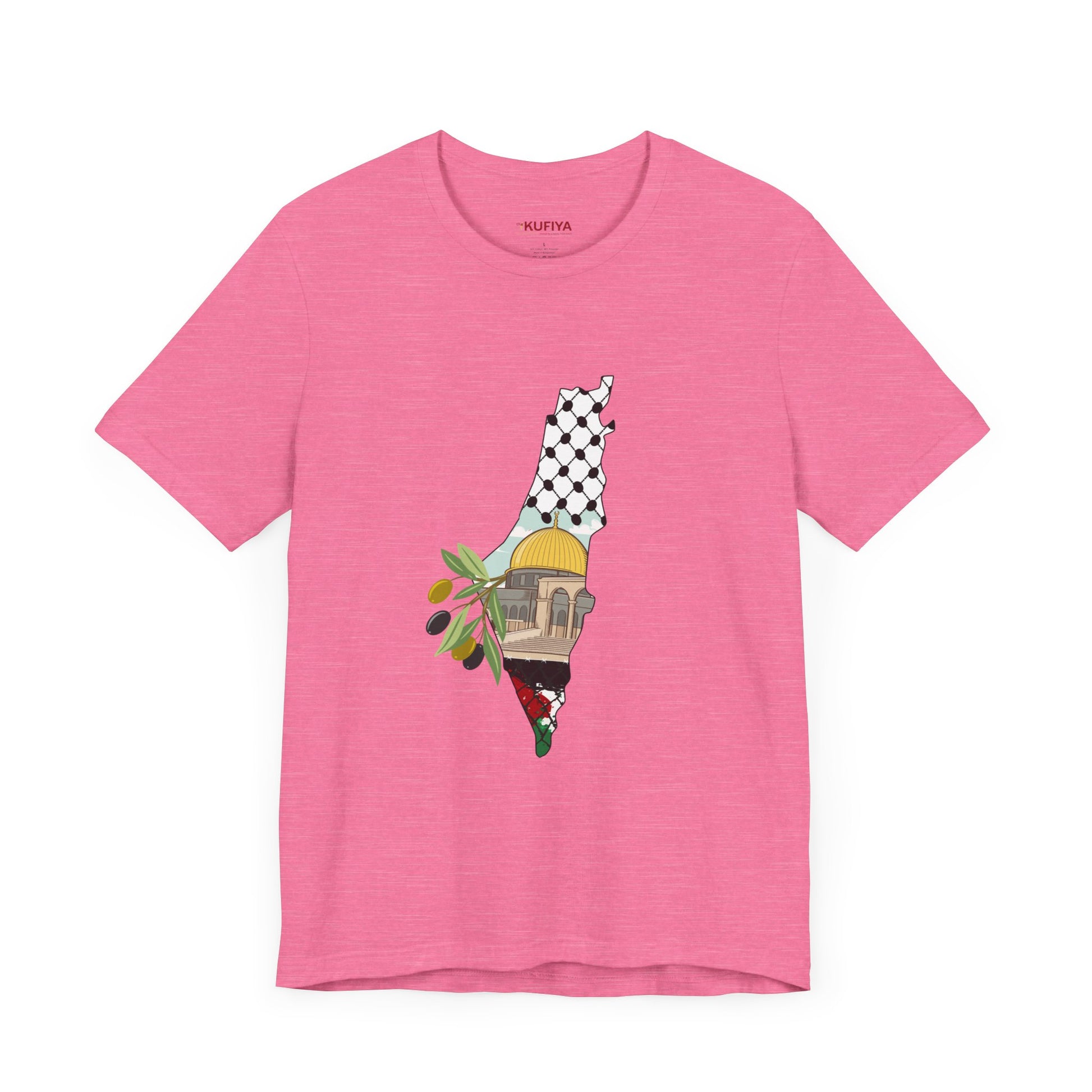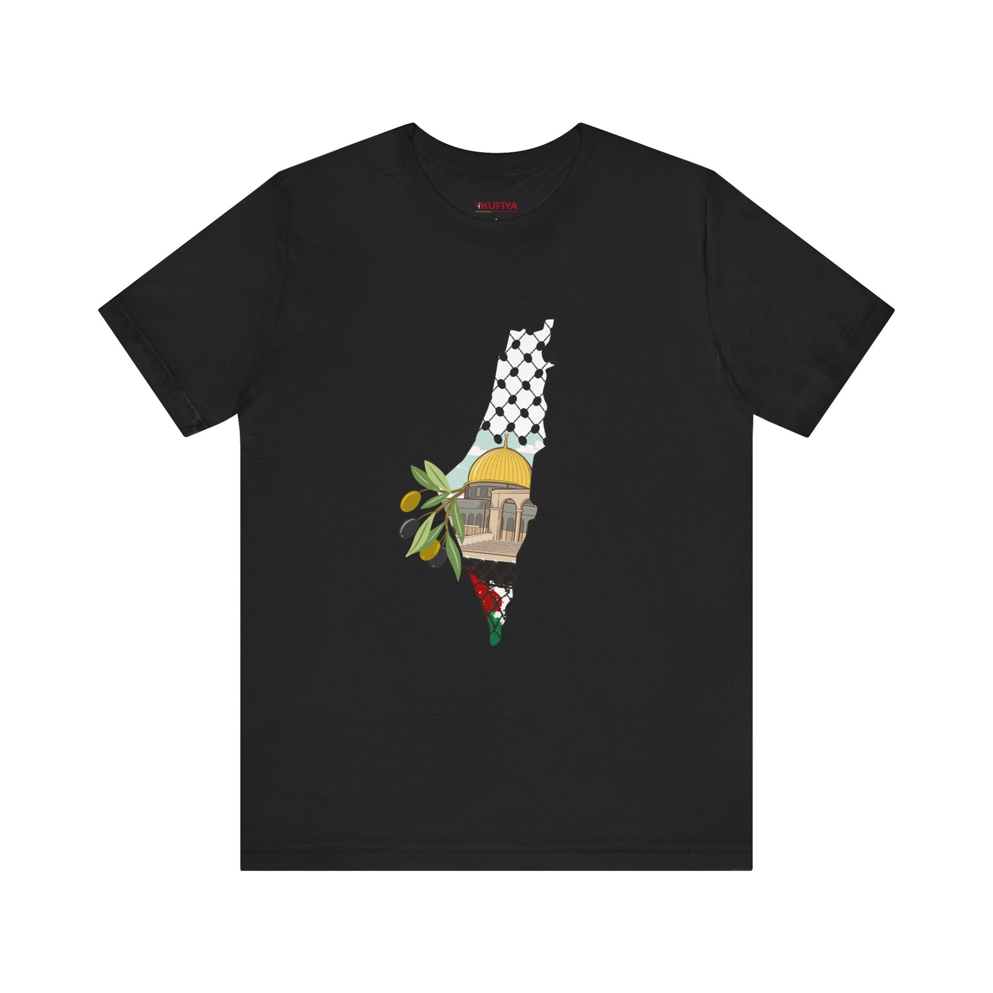 Featuring the outline of Palestine, adorned with the iconic Dome of the Rock and olive branches, this design is a powerful statement of support.